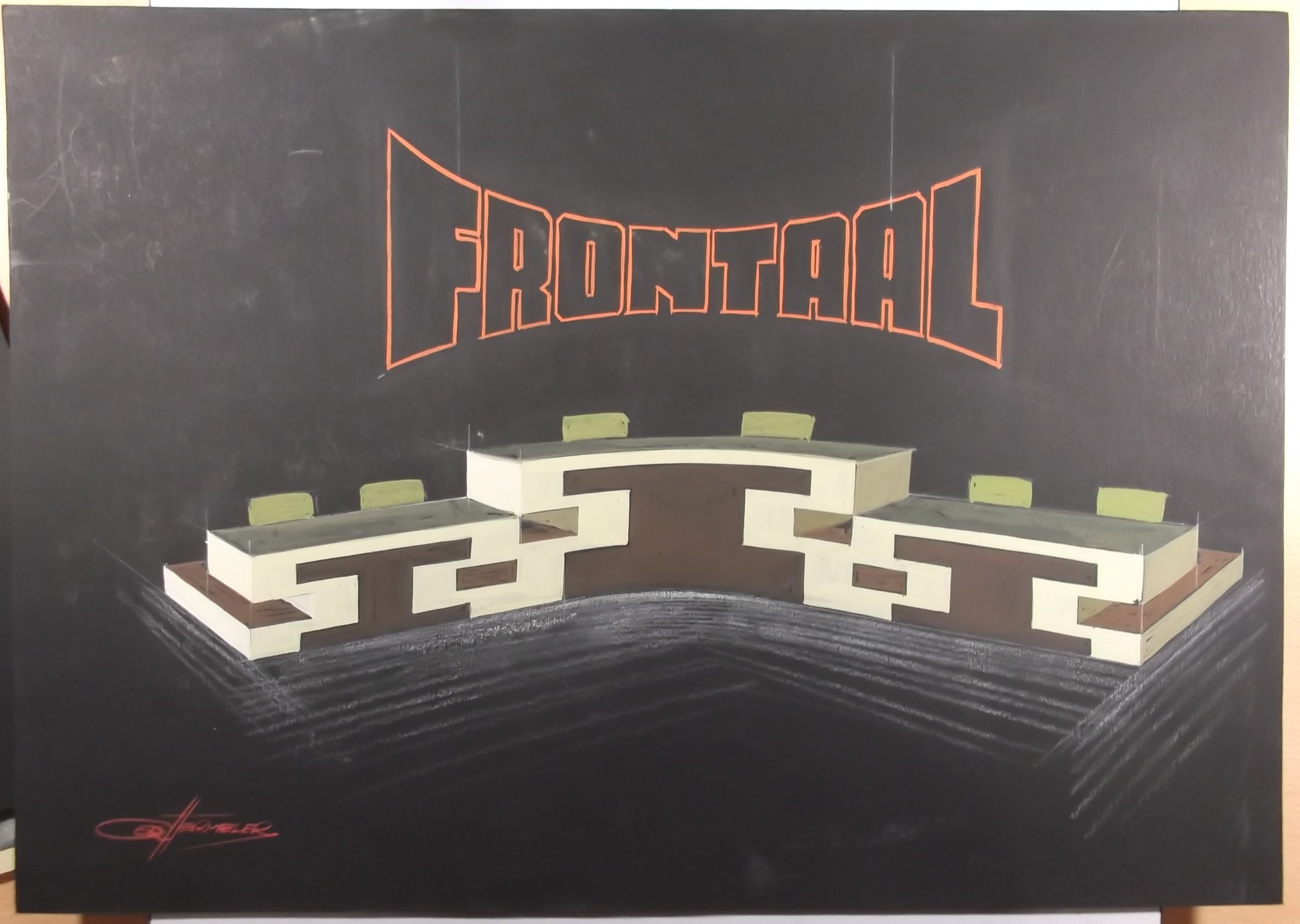 Decorontwerp van Cor Hermeler voor discussieprogramma Frontaal (NOS, 1977). Objectencollectie Beeld en Geluid, nummer 10401