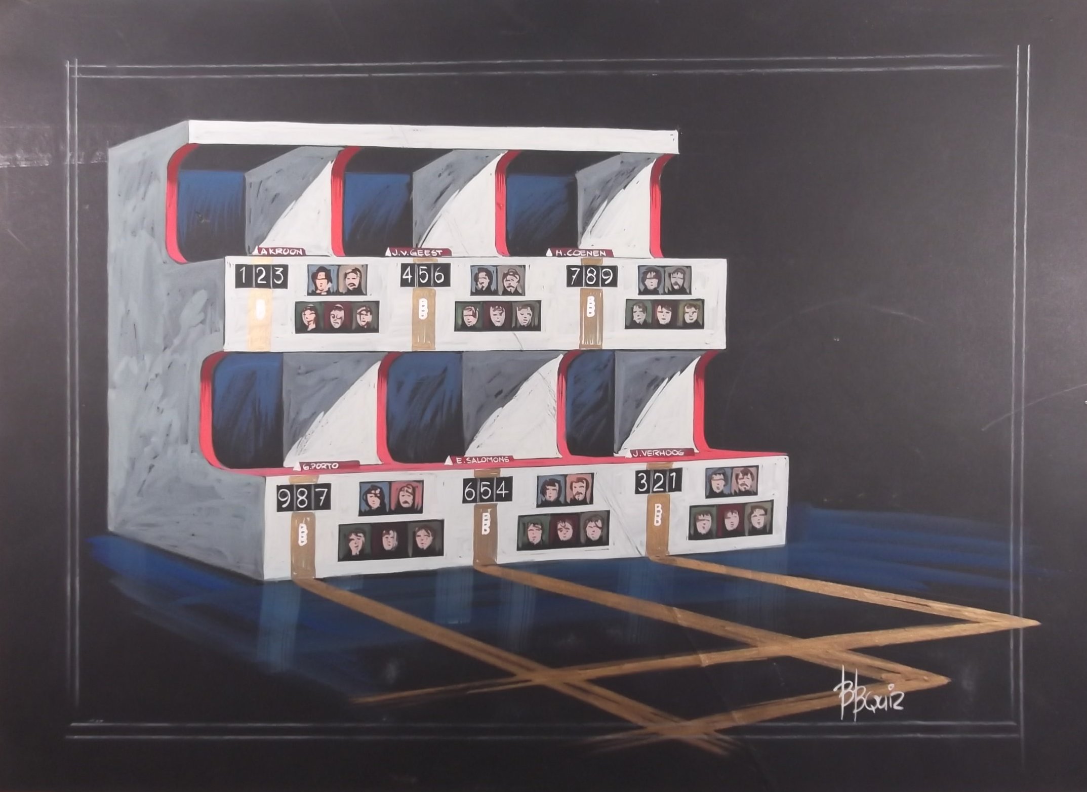 Decorontwerp van Cor Hermeler voor de BB-kwis (KRO, 1972). Objectencollectie Beeld en Geluid, nummer 10428.