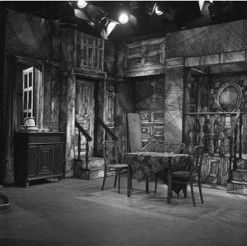 Foto van het decor van De Inca van Perusalem (VARA, 11-1-1967), regie Ton Lensink, decor Dorus van der Linden. Bron: fotocollectie van het Nederlands Instituut voor Beeld en Geluid.