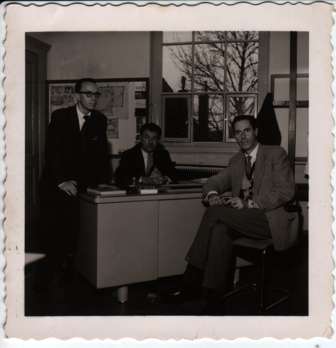 Portret van de Afdeling Decorontwerp in de Ambachtsschool, ca 1958. Vlnr Cor Hermeler, Peter Zwart en Fokke Duetz. Collectie Beeld en Geluid, collectienummer LA2662/Peter Zwart