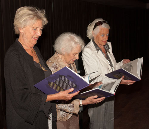 Ageeth Scherphuis, Tanja Koen en Karin Kraaykamp bladeren als eersten door het boek "Goedenavond dames en heren". Foto: Pieter Ernst Uyt den Boogaard/Beeld en Geluid.