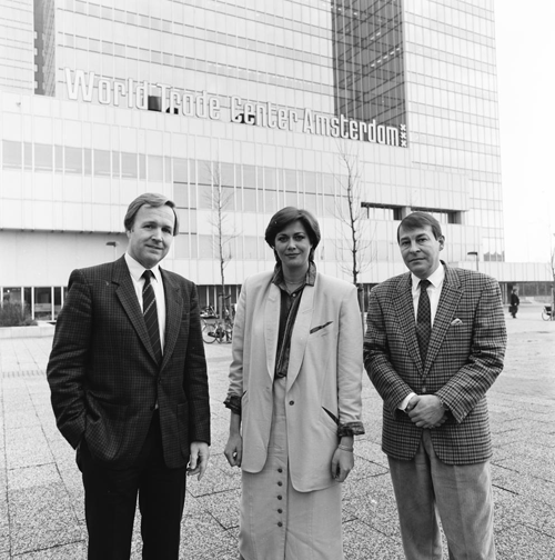 TROS Aktua Export, Jan Terlouw, Tineke Verburg, Marcel Bruijns voor het World Trade Centre in Amsterdam, TROS, 1987. Catalogusnummer FTA001002776, fotonummer 16 (oud archiefnummer 871504)