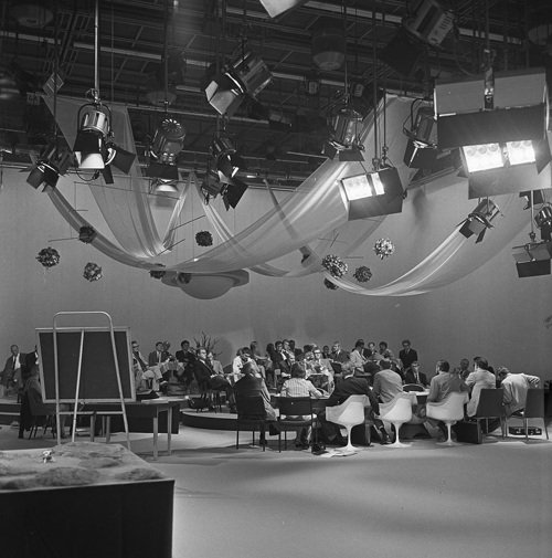 Persconferentie in TV studio Apollo-11 uitzending 15 juli 1969 (NTS 1969). Archief Nederlands Instituut voor Beeld en Geluid. Catalogusnummer FTA001004756_004 (archief_bron 69443).