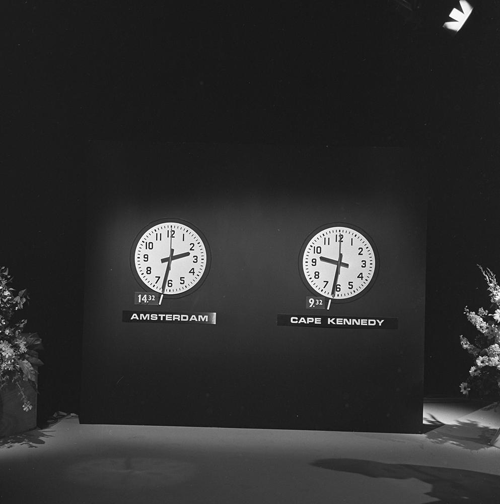Tijdsaanduiding TV studio Apollo-11 uitzending 15 juli 1969 (NTS 1969). Archief Nederlands Instituut voor Beeld en Geluid. Catalogusnummer FTA001004756_011 (archief_bron 69443).