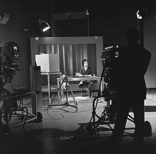 Eugenie Herlaar in het decor van het NTS journaal, 13-10-1966. Collectie Beeld en Geluid, fotonummer FTA001007253_001