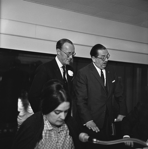 Prins Bernhard opent het Studiocomplex op het Omroepkwartier op 2 oktober 1967. Naast Prins Bernhard staat rechts NTS voorzitter Emile Schüttenhelm.NTS. Archief Beeld en Geluid, Archiefnummer FTA001009490, fotonummer 006. Oorspronkelijk archiefnummer 67401011.