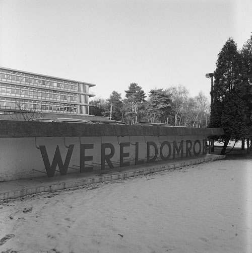 Het gebouw van de Wereldomroep aan de Witte Kruislaan 55 in Hilversum. 1982. Zendgemachtigde Wereldomroep. Archief Beeld en Geluid, catalogusnummer FTA001013272 fotonummer 008 (oorspronkelijk archiefnummer 8244).