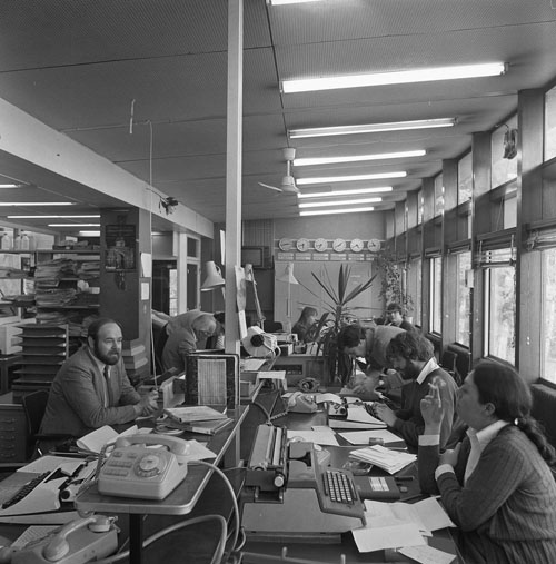 Interieur van het gebouw van de Wereldomroep aan de Witte Kruislaan 55 in Hilversum. 1982. Zendgemachtigde Wereldomroep. Archief Beeld en Geluid, catalogusnummer FTA001013273 fotonummer 015 (oorspronkelijk archiefnummer 8244).
