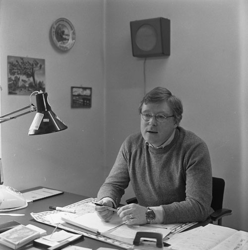 Medewerker in het gebouw van de Wereldomroep aan de Witte Kruislaan 55 in Hilversum. 1982. Zendgemachtigde Wereldomroep. Archief Beeld en Geluid, catalogusnummer FTA001013276 fotonummer 004 (oorspronkelijk archiefnummer 8244).