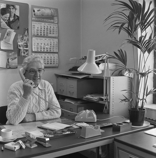 Medewerker in het gebouw van de Wereldomroep aan de Witte Kruislaan 55 in Hilversum. 1982. Zendgemachtigde Wereldomroep. Archief Beeld en Geluid, catalogusnummer FTA001013276 fotonummer 006 (oorspronkelijk archiefnummer 8244).