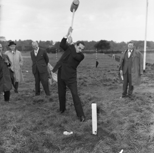 NTS-voorzitter Emile Schuttenhelm slaat de eerste paal als startsein voor de bouw van het Omroepkwartier, 21 oktober 1961. Archief Beeld en Geluid FTA001028141, fotonummer 005. Oorspronkelijk archiefnummer 61360N.