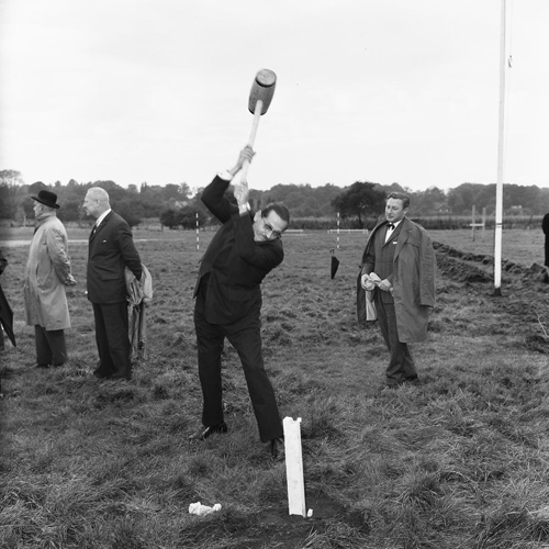 NTS-voorzitter Emile Schuttenhelm slaat de eerste paal als startsein voor de bouw van het Omroepkwartier, 21 oktober 1961. Archief Beeld en Geluid FTA001028141, fotonummer 008. Oorspronkelijk archiefnummer 61360N.