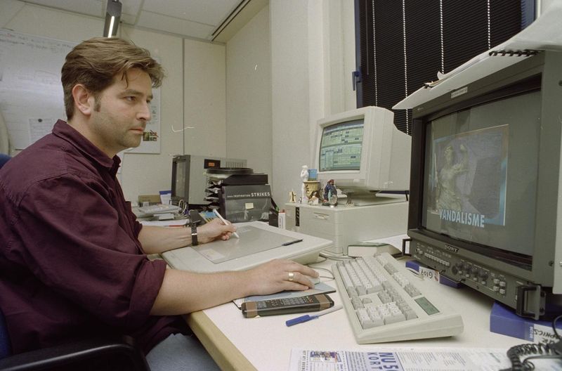 Ontwerpen van dagelijkse grafiek op de redactie van het NOS Journaal met behulp van de Paintbox. Fotocollectie Beeld en Geluid.