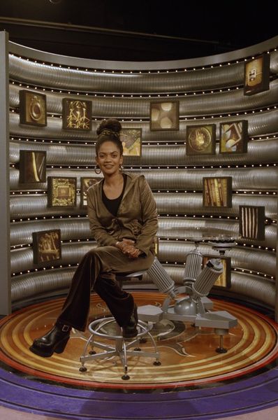 Aldith Hunkar in het decor van het Jeugdjournaal 1995. Fotocollectie Beeld en Geluid
