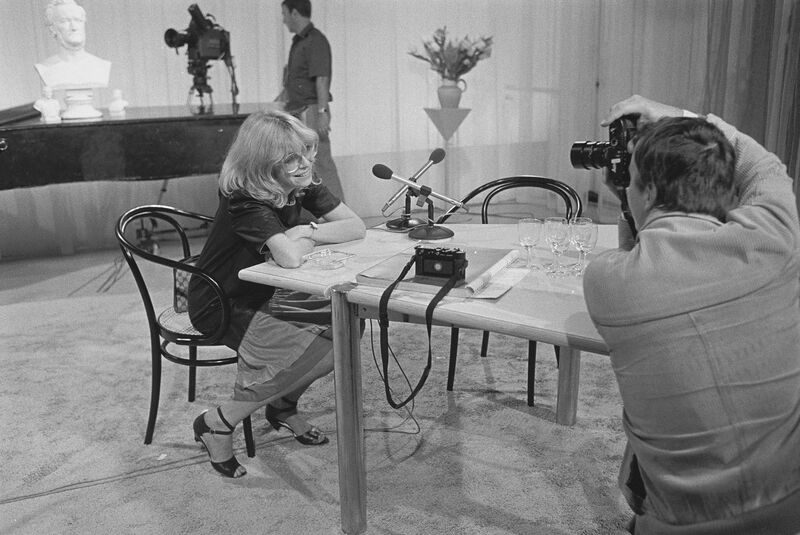 Ellen Jens wordt gefotografeerd in decor Hier is ... Adriaan van Dis
