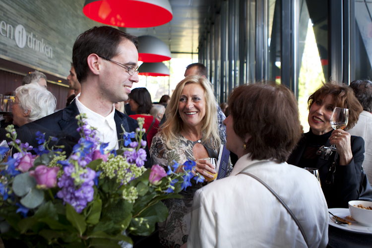 René Koenders praat met Leonie van Bladel terwijl Ingrid Drissen en Marianne Bierenbroodspot toekijken. Copyright foto: Babet Hogervorst (BenCreatives). Valt niet onder de cc-licentie.