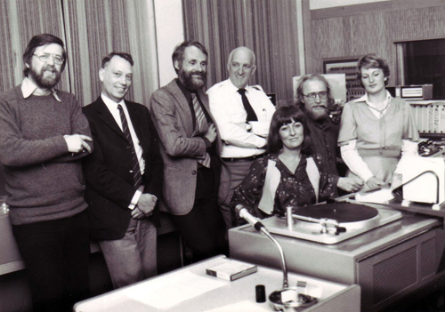 Ingrid Drissen en collega's van Hobbyscoop in de studio. Foto uit privécollectie van Ingrid Drissen, valt niet onder de cc-licentie.