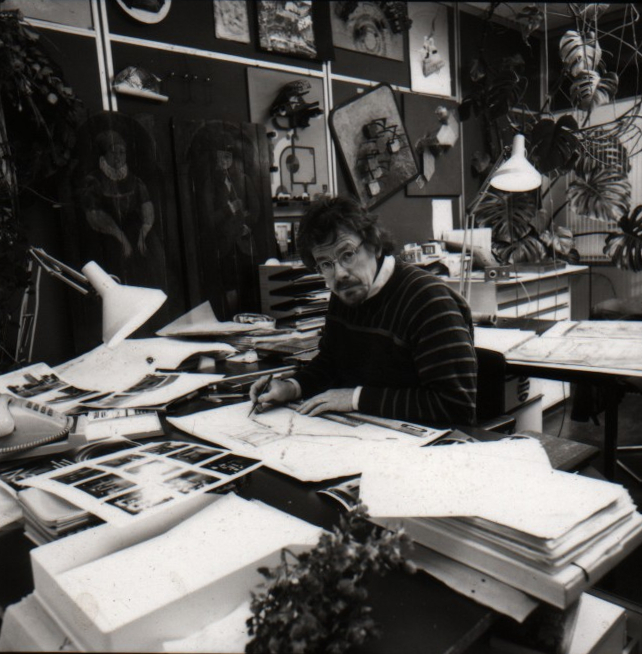 Decorontwerper Freek Biesiot in zijn atelier in het hoofdgebouw, 1988. Collectie Beeld en Geluid, LA1225-2--82_109