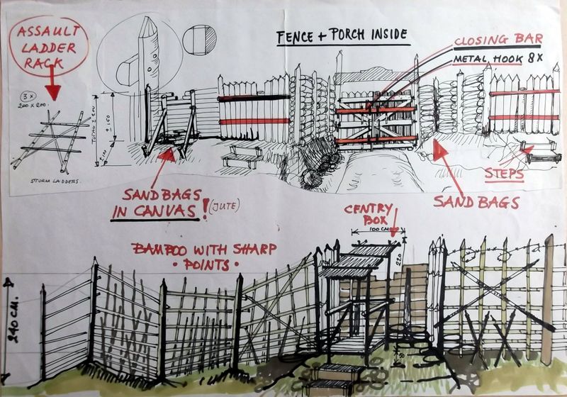 Ontwerp omheining Kamp Lenkoedjoe voor In naam der Koningin. Collectie Freek Biesiot, Beeld en Geluid archiefnummer LA1225-2-97 volgnummer 45.