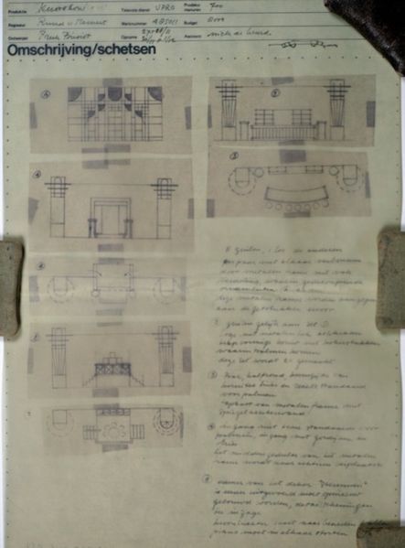 Ontwerptekening van Freek Biesiot voor het decor van Waar heb dat nou vor nodig (1972). Objectnummer 15189, collectie Beeld en Geluid