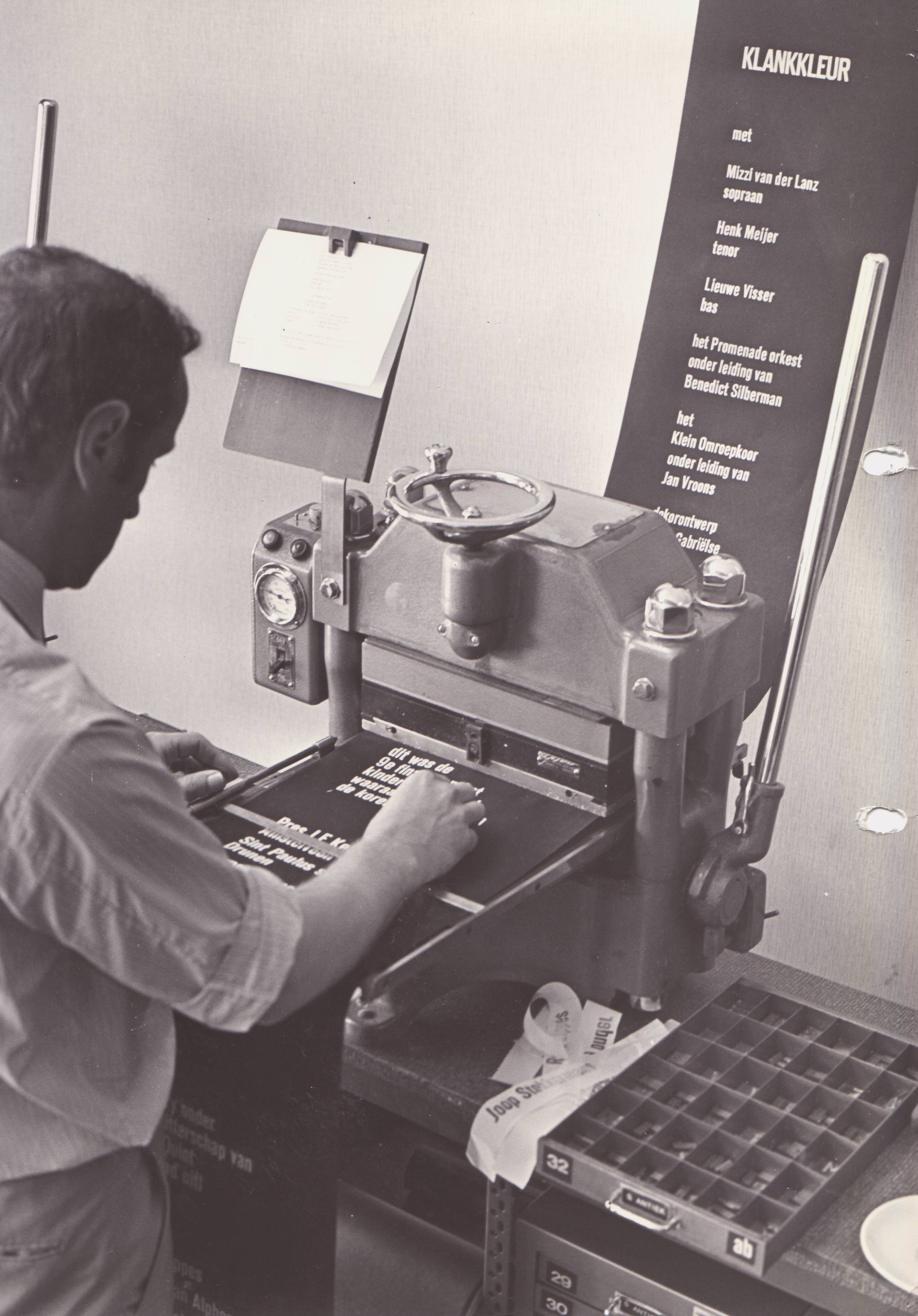 Grafisch ontwerper aan het werk met de Masseeley hotpress met de titelrol van Klankkleur, ca 1982, Fotograaf onbekend.