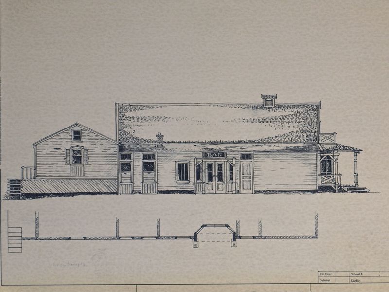 Decortekening van Freek Biesiot voor De zomer van '45 (NCRV, 1991). Collectie Beeld en Geluid, collectienummer LA1225-2-123.