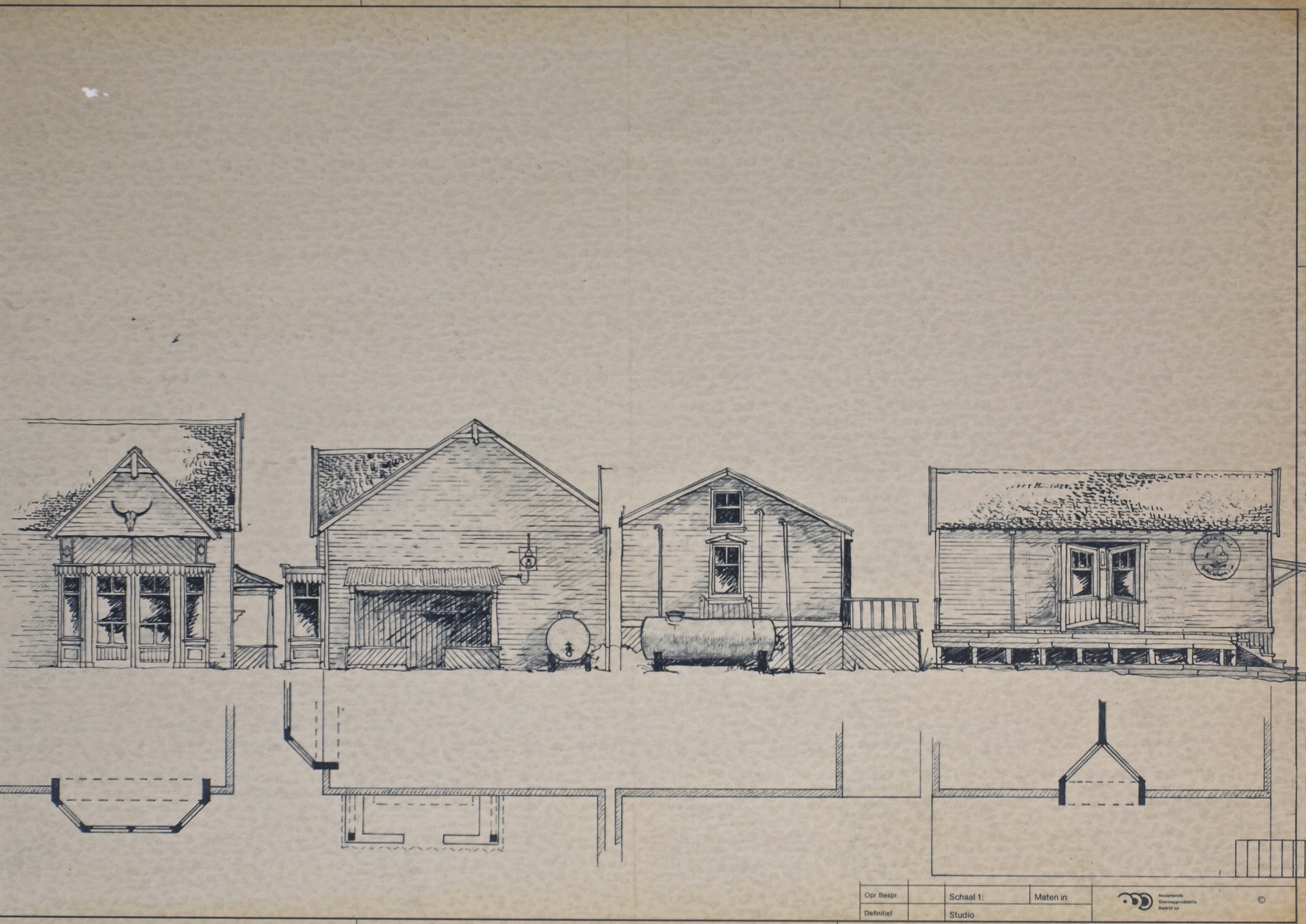 Decortekening van Freek Biesiot voor De zomer van '45 (NCRV, 1991). Collectie Beeld en Geluid, collectienummer LA1225-2-123.