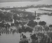 Filmopnamen vanuit een KLM-vliegtuig van de overstroomd gebied langs de grote rivieren Maas, Waal, Lek en IJssel.