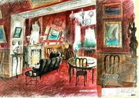 Decortekening van Wim Bijmoer voor Hollands glorie (dramaserie). Ontwerpassistent is Theun van de Woestijne.