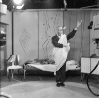 Foto's genomen op 17 januari 1957. Medewerkenden: Wim Ibo, Jetty Paerl, Sophie Stein, Tineke van Leer, Simon Carmiggelt, Joop Doderer, Dub du Bois, Jan Blok en omroepster Karin Kraaykamp.