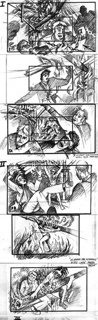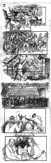 Freek Biesiot is verantwoordelijk voor de sets, rekwisieten en kostuums van In naam der Koningin. Daarnaast maakt hij storyboards enn situatieschetsen voor lastige scenes met special effects en/of veel actie. Hij werkt samen met assistent/artdirector Marco Rooth en een Filipijnse crew. Onderstaand artwork maakt deel uit van de schenking van Biesiot aan het Nederlands Instituut voor Beeld en Geluid.