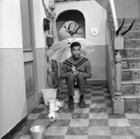 Foto's genomen op de set van Pension Hommeles op 28 december 1957 tijdens opnames van aflevering 4 "Ketoto". Te zien zijn o.a. Maya Bouma, Donald Jones, Rob van der Bas en Henk van Ulsen.