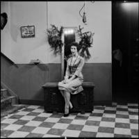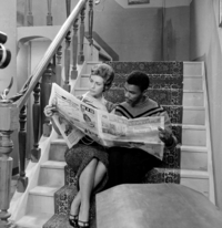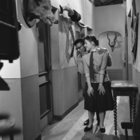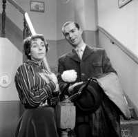 Enkele foto's genomen op de set van Pension Hommeles op 5 oktober 1957 tijdens de opnames van aflevering 1 "Kamers kijken". Te zien zijn Mieke Verstraete, Mimi Kok, Walter Kous en Donald Jones