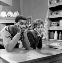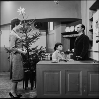 Foto's genomen op de set van Pension Hommeles op 2 februari 1959 tijdens opnames van aflevering 14 "Gewoon als iedereen". Te zien zijn Mieke Verstraete, Kees Brusse, Donald Jones, Maya Bouma, Ank van der Moer en Guus Hermus.