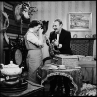 Foto's genomen op de set van Pension Hommeles op 1 maart 1958 tijdens opnames van aflevering 6 "Deze kant boven". Te zien zijn Maya Bouma, Donald Jones, Mieke Verstraete, Mimi Kok en Walter Kous en Ramses Shaffy.