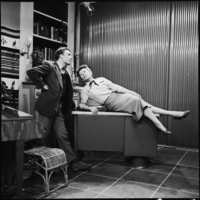Foto's genomen op de set van Pension Hommeles op 30 november 1957 tijdens opnames van aflevering 3 "Franse slag". Te zien zijn o.a. Maya Bouma, Donald Jones, Mary Dresselhuys en Henk van Ulsen.