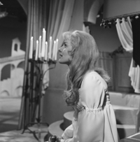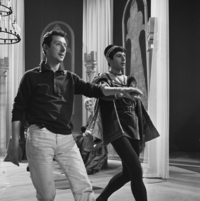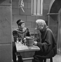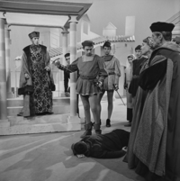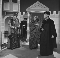 Enkele foto's genomen op de set tijdens de opnames van het televisiespel Romeo en Julia door Th. van den Brink. Te zien zijn o.a. Hans Croiset als Benvolio, Rie Gilhuys als Lady Capulet, Carol Linssen als Romeo en Paula Petri als Julia.
