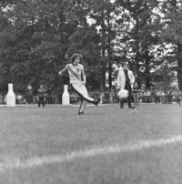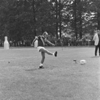 Punter-penalty van Koos Postema (VARA), in het midden voetbalscheidsrechter Charles Corver, links opperscheids Anton Geesink | |