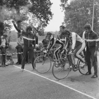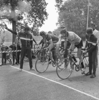Het begin van de wielerwedstrijd tussen Krijn Torringa (AVRO) en de afgetrainde Fred Benavente (NCRV) |