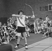 overleg voor het boogschieten : Bob Bremer (Hoofd Sport AVRO), Anton Geesink (scheidsrechter), Cootje van Doesburg (KRO, op de rug gezien), Willibrord Fréquin (KRO) |