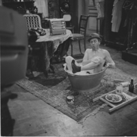 Enkele foto's genomen op de set van Stiefbeen en zoon door R. Frings op 24 september 1963 tijdens de opnames van aflevering 19 "Kostgangers gevraagd". Te zien zijn Rien van Nunen en Piet Römer.
