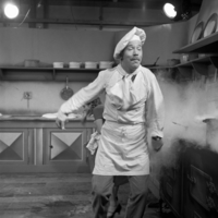 Foto's geschoten tijdens de opnames van de kerstspecial "Meneer King maakt een kerstverhaal" op 26 december 1959. Te zien zijn Piet Römer als meneer King, Cecilia Lichtveld als Zeefje, Sepha Dierikx als Gracia Morena, omroepster Ageeth Scherphuis en Marcelle Meuleman als Picollo.