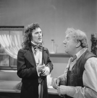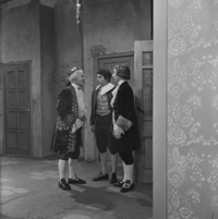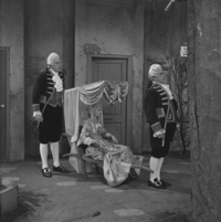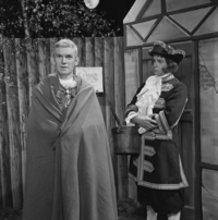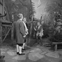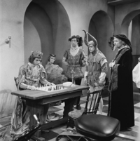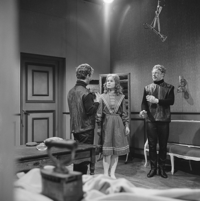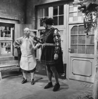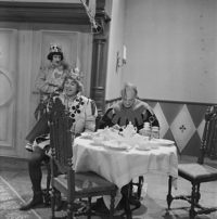 Foto's genomen door A. Vente op de set van Vrouwtje Bezemsteel tijdens de opnames van aflevering 15 "De valse prins" op 21 februari 1966. Te zien zijn Henk Voges als kleermaker, Herman Vinck als knecht, Bab Wijsman als koning, Marijke Bakker als prinses, Geert Tijssens als prins, John Koch als eerste dienaar en Paul Brandenburg als tweede dienaar.