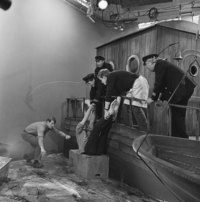 Foto's genomen door W. Veenman op de set van Vrouwtje Bezemsteel tijdens de opnames van aflevering 17 "De zeemeerman of de vreemde vangst van kapitein Kaplaars". Te zien zijn Lex Goudsmid, Ad Hoeymans, Wim Kouwenhoven, Geert Thijssens, Rudolf Damsté en Jacques Commandeur