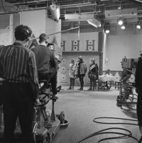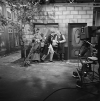 Foto's genomen door W. Veenman op de set van Vrouwtje Bezemsteel tijdens de opnames van aflevering 19 "De soldaat met de stoute schoenen" op 29 november 1966. Te zien zijn Ad Hoeymans, Jan Kieboom, Koen Pronk, Yolande Bertsch, Herman Vinck, Sjef van Leeuwen en Geert Tijssens.