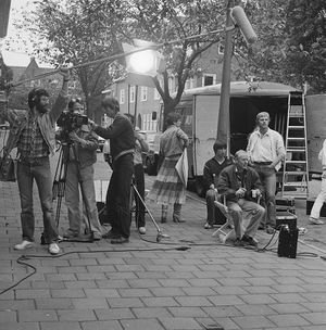 Guus van Waveren (zittend) bij de opnames van dramaserie Even naar het feest (NOS, 1981)