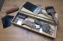 Afgebladderd stucwerk maken de decorateurs door op de wand stukken bitumenpapier of karton te plakken, het geheel te schilderen en dan het papier stuk te scheuren waardoor een soort loshangend stucwerk wordt gesuggereerd. Rotsen worden gemaakt van een onderbouw van praks en laten waarover natgemaakt en verfrommeld karton wordt gespijkerd. Daar overheen een laag Migaplast, dat is een mengsel van krijt, gips en lijm.