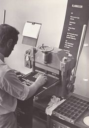 | 12 aug 2013 20:30 | Scan10063.JPG (bestand) | 875 kB | Grafisch ontwerper aan het werk met de Masseeley hotpress met de titelrol van Klankkleur, ca 1982, Fotograaf onbekend. | 1 | |