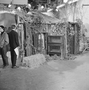 Foto's genomen op de set van Vrouwtje Bezemsteel tijdens de opnames van aflevering 6 "Mijnheer Bijgeloof". Te zien Karin Haage als Vrouwtje Bezemsteel, Lex Schoorel als Sam Pardoes, Ab Hofstee als Mijnheer Bijgeloof , Arend Hauer als zijn butler, Ad van Gessel als glazenwasser en Mariette Flink en Jack Horn als zigeuners.Deze aflevering vertelt Vrouwtje Bezemsteel aan Sam een verhaal over angst en bijgeloof met in de hoofdrol natuurlijk mijnheer Bijgeloof.